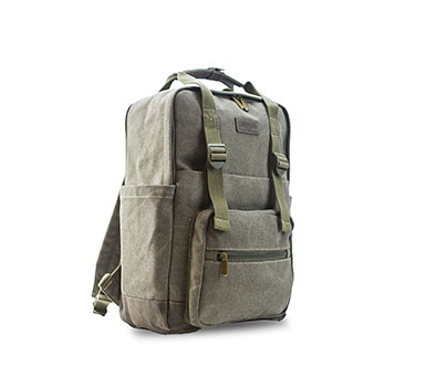 Mochila en tela canvas combinada con símil cuero, apertura superior y cierre. Bolsillo con cierre al frente y bolsillos en ambos costados. Bolsillos internos. Asa corta de mano y correas acolchonadas y regulables para la espalda. Altura: 46 cm | Base: 30 cm | Profundidad: 16 cm